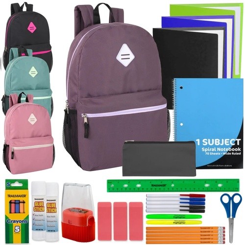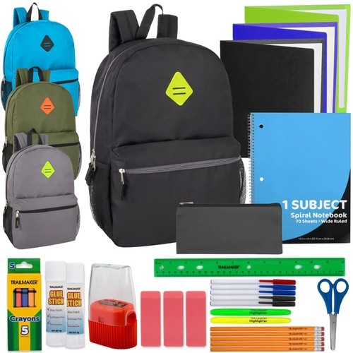 Each backpack is filled with school supplies that are packaged in a plastic bag inside the backpack. The contents are listed below.
