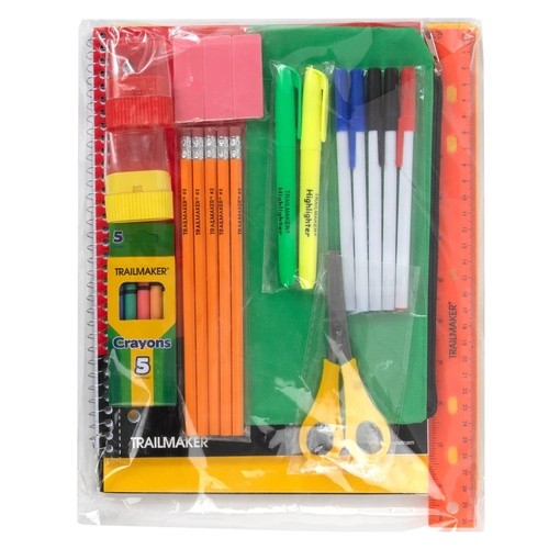 All together we hope that these supplies will help get your kid (or kids) started on the school year. Most of our backpacks come in black, green, red, and blue. Come early to get first choice on color.